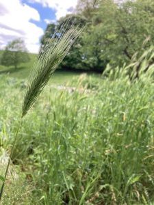 Im April wurde ein neuer Acker aus Wiesenumbruch mit Emmer eingesät – ein Anbau für weitere Backversuche. Das relativ kühle Frühjahr hat die Keimung bisher verlangsamt; andererseits ist ja für Wintergetreide wie Roggen, der im Herbst eingesät wird (Erhaltungszüchtung ), die Winterkälte für die Keimung erwünscht und notwendig, (Vernalisation).